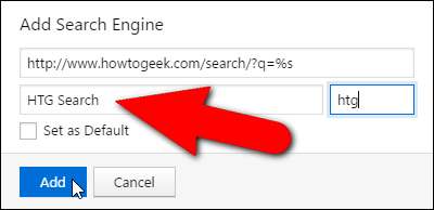 Arama Motoru Ekle iletişim kutusunda, sitenin arama motorunun URL'si üst düzenleme kutusuna girilir ve sitenin URL'si varsayılan olarak bunun altındaki düzenleme kutusunda görüntülenir. Ancak, bunu arama motorları listesinde görüntülenecek site için bir adla değiştirebilirsiniz. Aşağıdaki resimde mavi ile sınırlanmış düzenleme kutusuna bir takma ad da girebilirsiniz. Takma ad, o sırada mevcut arama motorunuzu değiştirmek istememeniz durumunda, bunu adres çubuğuna arama teriminizin ardından girmenize olanak tanır. Örneğin, "htg" takma adıyla arama motorları listeme How-To Geek'i ekledikten sonra, How-To Geek'te Vivaldi'yi aramak için adres çubuğuna "htg vivaldi" gibi bir şey girebilirim.