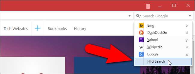 Arama kutusunu arama motoru olarak Nasıl Yapılır Geek'i kullanacak şekilde değiştirmek için, Arama kutusundaki büyüteç düğmesini tıklayın ve açılır listeden "HTG Araması" (veya adını verdiğiniz şeyi) seçin.