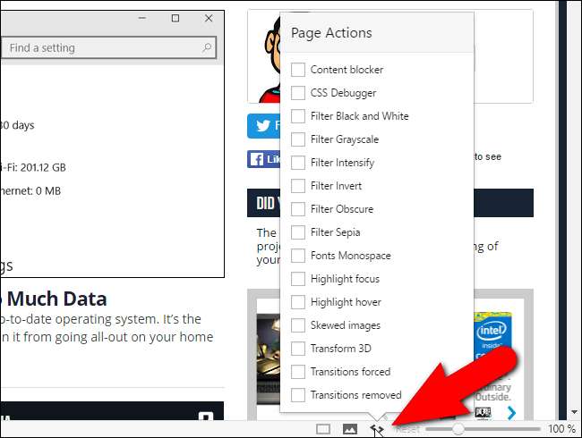 Vivaldi'deki Sayfa Eylemleri, web sitelerinin daha kolay okunmasını veya tercihlerinize uyacak şekilde görüntülenmelerini sağlar. Tarayıcı penceresinin sağ alt köşesindeki durum çubuğundaki “<>” simgesine tıklayın. Mevcut web sitesine uygulamak istediğiniz filtrelerin onay kutularını seçin. Seçili sayfa eylemleri, şu anda görüntülemekte olduğunuz web sayfası için geçerlidir. Böylece, aynı tarama oturumunda farklı web sitelerine farklı filtreler uygulayabilirsiniz.