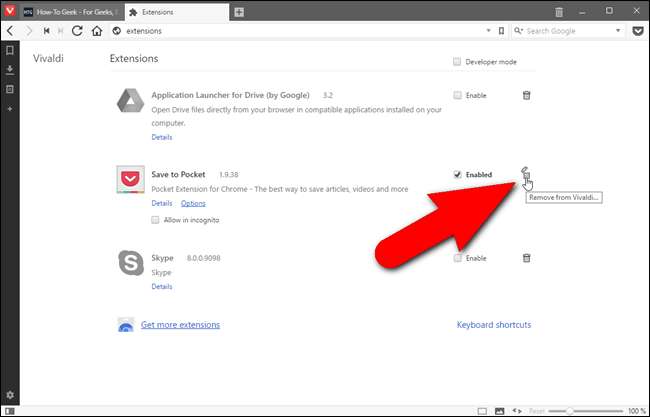 Düzgün çalışmayan bir uzantıyı kaldırmak istiyorsanız, adres çubuğuna "vivaldi: // uzantıları" (tırnak işaretleri olmadan) girerek uzantıları yönetebilirsiniz. Mevcut sekmede şüpheli bir şekilde Chrome’un uzantı yöneticisine benzeyen bir uzantı yöneticisi göreceksiniz. Kaldırmak istediğiniz uzantının yanındaki çöp kutusu simgesine tıklamanız yeterlidir ve uzantı Vivaldi'den kaldırılır. Ayrıca kullanmak istemediğiniz uzantıları devre dışı bırakabilirsiniz.