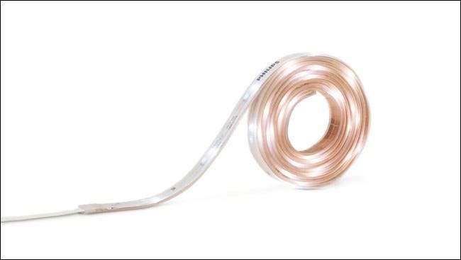 Mutlaka bir ampul olmasa da, $ 90 Hue LightStrip Plus ışıkları hemen hemen her şeye yapışabilen yapışkan bir arkalığa sahip düzleştirilmiş ip ışıklardır.