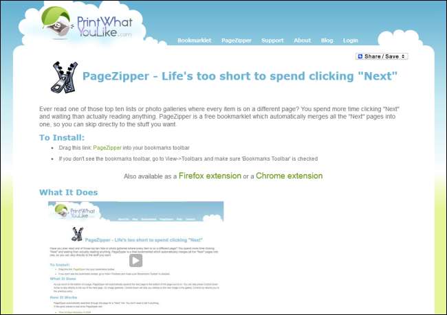 Birçok site, sayfa görüntülemeleri oluşturmak için makalelerini "sonraki" bağlantılarla daha küçük parçalara ayırır. Ancak, makaleyi okumaya çalışırken bu çok can sıkıcı ve dikkat dağıtıcı olabilir. PageZipper bookmarklet, çok sayfalı makaleleri tek bir sayfada görüntülemenize olanak tanır, böylece tek yapmanız gereken, bir makaleyi okumak için kaydırmaktır.