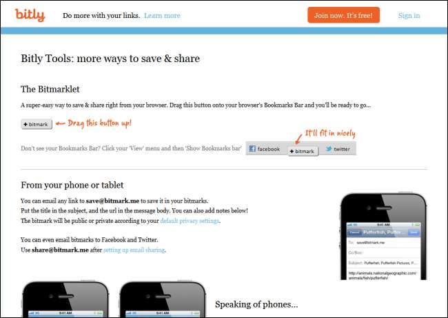 Çok sayıda URL paylaşıyorsanız, Bitly bitmarklet kısaltılmış URL'ler oluştururken size zaman ve güçlük kazandırır. Şu anda görüntülemekte olduğunuz web sitesi için kısaltılmış bir URL oluşturmak için Bitly sitesine gitmeniz gerekmez. Mevcut web sitesinin kısaltılmış bir URL'sini oluşturmak için "bit işareti" düğmesini tarayıcınızın yer işaretleri çubuğuna sürükleyip tıklamanız yeterlidir.