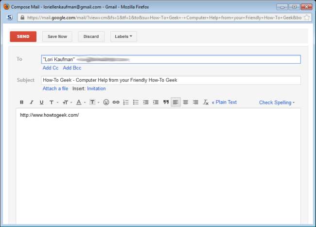 İnternette araştırma yaparken, muhtemelen kendinize not almak istediğiniz ve daha sonra görüntülemek üzere URL'sini kaydetmek istediğiniz birçok web sitesine rastlamışsınızdır. Gmail Bu! bookmarklet bunu yapmayı çok kolaylaştırır. Geçerli web sayfasının başlığının konu olduğu ve iletinin gövdesinin URL'yi içerdiği bir Gmail oluşturma penceresi açar. Gövdede istediğiniz diğer notları ekleyebilir, Kime kutusuna bir e-posta adresi girebilir ve e-postayı gönderebilirsiniz.