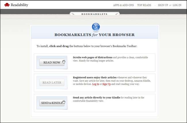 Okunabilirlik bookmarklet ayrıca daha temiz bir görüntüleme için bir web sayfasını temizlemenize olanak tanır. Sayfayı geçerli görüntüleme için temizlemenize, daha sonra okumak için (kayıt gerektirir) ve Kindle'ınıza göndermenize olanak tanıyan yer imleri vardır. Ayrıca orada araçlar, uygulamalar ve hizmetler Okunabilirliğin birden çok platformda ve çeşitli şekillerde keyfini çıkarmanızı sağlayan.