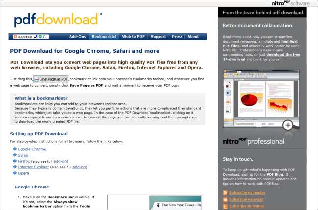 PDF olarak indir bookmarklet geçerli web sayfasını bir PDF dosyasına dönüştürmenize olanak tanır. Firefox, Chrome, Opera, Internet Explorer ve Opera dahil herhangi bir web tarayıcısında çalışır.