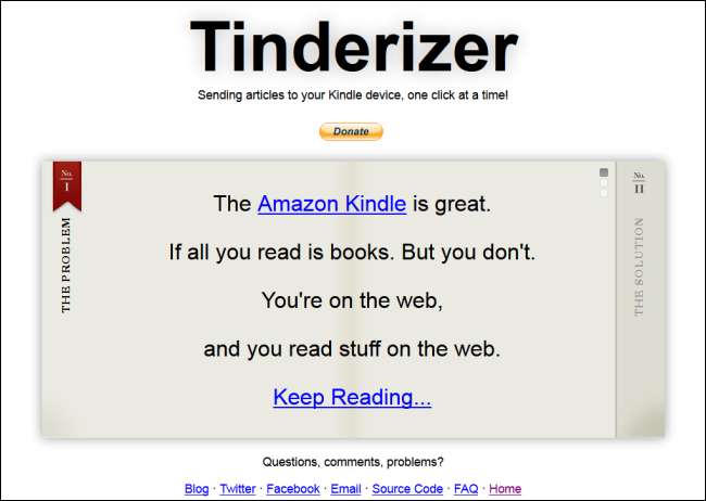 Bir Kindle'ınız varsa web sayfalarındaki makaleleri daha sonra okumak için doğrudan Kindle'ınıza kolayca gönderebilirsiniz. Hizmet ücretsiz ve hızlıdır, ancak kullanmak için biraz ilk kurulum gerektirir. Ziyaret edin Tinderizer web sitesinde, Kindle e-posta adresinizi girin (yani, soyadını[email protected]) ve Tinderizer sunucusuna size e-posta göndermesi için yetki verin.