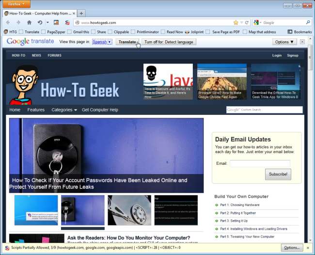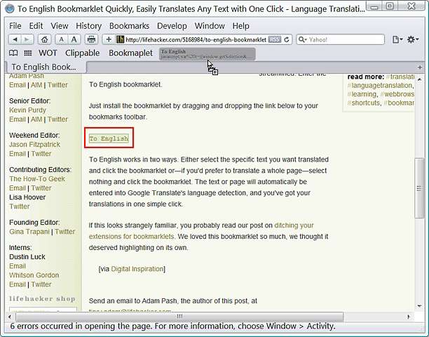 Google Çeviri Çubuğu bookmarklet herhangi bir web sayfasını bir dilden diğerine çevirir. Bağlantıyı tarayıcınızın yer imleri çubuğuna sürükleyin ve tıklayın. Google Çeviri Çubuğu görüntülenir, bir dil seçmenize ve ardından web sayfasını tek tıklamayla çevirmenize olanak tanır.