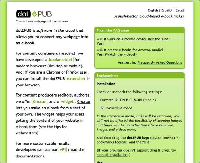 Bu makalenin başlarında, web sayfalarını daha sonra okumak için saklayabileceğiniz PDF dosyalarına nasıl dönüştürebileceğinizi, URL'leri kendinize nasıl kolayca e-postayla gönderebileceğinizi ve web sayfalarını kendiniz ve arkadaşlarınızla nasıl paylaşacağınızı göstermiştik. Ayrıca dotEPUB yer imini (ve Chrome uzantısını) kullanarak web sayfalarını e-Kitaplara dönüştürebilirsiniz. Web sayfası EPUB formatına dönüştürülür ve yeni bir sekmede görüntülenir. EKitabı sabit sürücünüze kaydetmek için Kaydet düğmesini kullanın. Ardından, daha sonra okumak için EPUB formatını kabul eden diğer cihazlara aktarabilirsiniz.