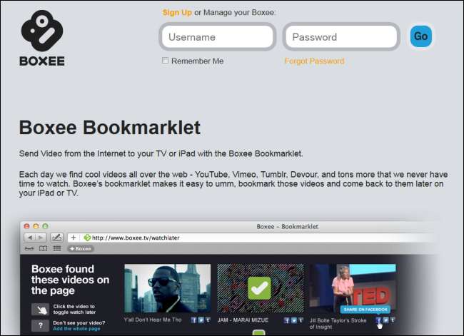 Boxee, TV'nizde İnternetteki filmleri, TV şovlarını ve video klipleri izlemenizi sağlar. Boxee bookmarklet, daha sonra görüntülemek için doğrudan tarayıcınızdan Boxee sıranıza kolayca video eklemenize olanak tanır.