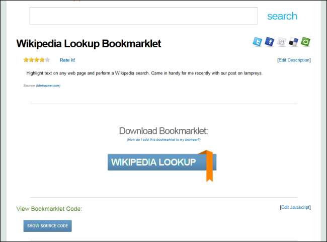 Daha fazlasını öğrenmek için Wikipedia'daki web sayfalarından öğe aramak isterseniz, Wikipedia Araması bookmarklet faydalı olacaktır. Bir web sayfasındaki metni vurgulamanın ve Wikipedia'da hızlıca aramanın hızlı ve kolay bir yoludur.