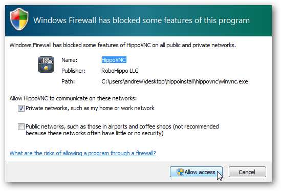 Güvenlik duvarı uygulamanız tarafından istenirse, HippoVNC'ye erişime izin vermeyi seçin.