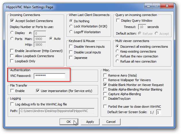 Ayarlar penceresinde, Kimlik Doğrulama altına bir parola yazın ve Tamam'ı seçin.