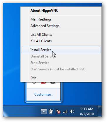 HippoVNC'nin bilgisayarınızı her başlattığınızda çalışmasını istiyorsanız, onu bir hizmet olarak çalıştırabilirsiniz. (Aksi takdirde, onu her kullanmak istediğinizde manuel olarak başlatmanız gerekecektir.) HippoVNC'yi bir hizmet olarak çalıştırmak için, Sistem Tepsisi simgesine sağ tıklayın ve Hizmeti Kur'u seçin.