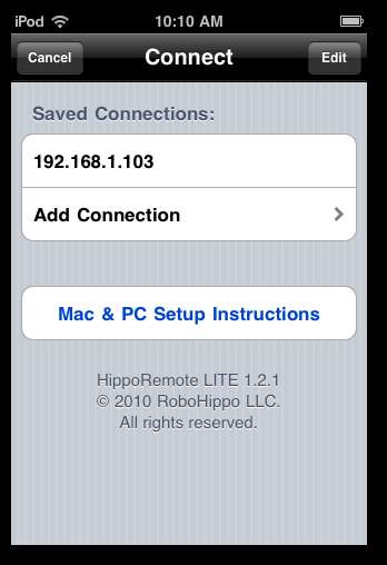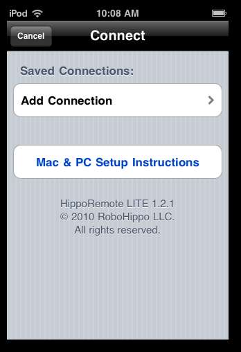 Sonra yapmanız gereken iPhone veya iPod Touch'ınızı WiFi ağınıza bağlayın . Bağlandıktan sonra HippoRemote Lite Uygulamasını açın ve Bağlantı Ekle'yi seçin.