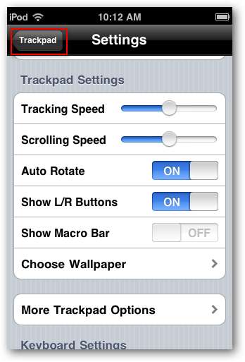 İzleme ve kaydırma hızı gibi belirli ayarlamaları yapabileceğiniz HippoRemote Ayarları ekranı tarafından karşılanacaksınız. Makroları ayarlama gibi bazı seçenekler yalnızca HippoRemote'un tam (ticari) sürümünde mevcuttur. İzleme dörtgenine geçmek için sol üstteki İzleme Dörtgeni düğmesine dokunun.
