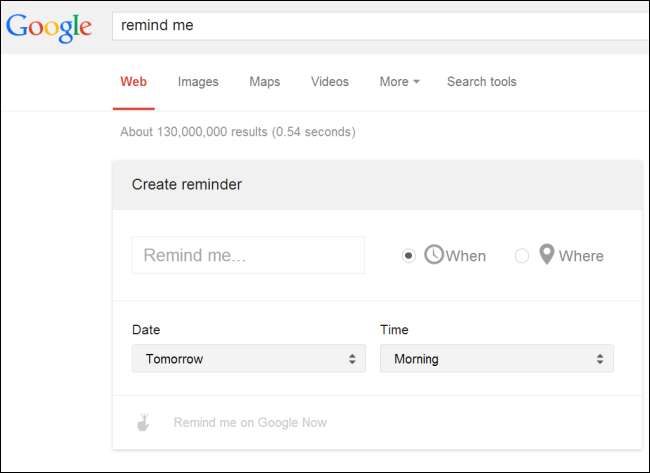 Bunu tarayıcınızdan da yapabilirsiniz. Google web sitesinde "bana hatırlat" için bir arama yapın ve form açılacaktır. Aynı türden "[do something]’ye [time]’te hatırlat" ifadesini Google web sitesine yazarak daha spesifik bir hatırlatıcı da ayarlayabilirsiniz.