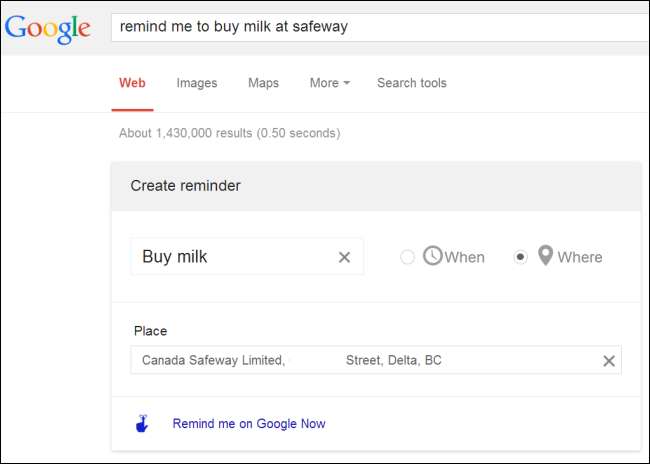 Bu aynı zamanda bir aramayla da çalışır - sadece "bana [do something]'ü [location]'te hatırlat" araması yapın. Konuma vardığınızda hatırlatıcı görünecektir. Google Asistan, yakındaki bir konumu tahmin edecek kadar akıllıdır, bu nedenle "[grocery store chain]'dan süt almamı hatırlat" derseniz, Google Asistan söz konusu market için en yakın konumu kullanır.