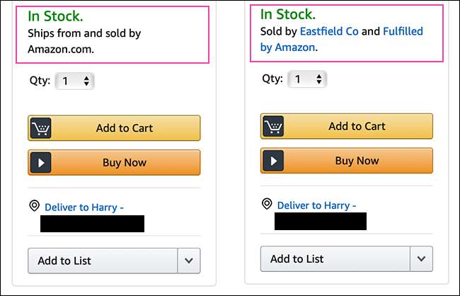 Amazon, sağ taraftaki "Stokta" bölümü altında satıcıyı ve göndericiyi listeler.