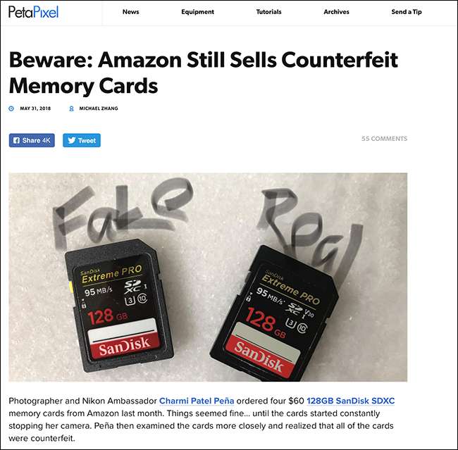 SanDisk, en iyi SD kartlarından ve diğer depolama donanımlarından bazılarını yapar. How-To Geek'teki eserlerinin büyük hayranlarıyız. Ne yazık ki, bunların üçte birine kadar olduğunu tahmin ediyorlar Satılan SanDisk hafıza kartları sahtedir . Ve tabi ki, bazı insanlar bu sahte kartları Amazon'dan satın alıyor .