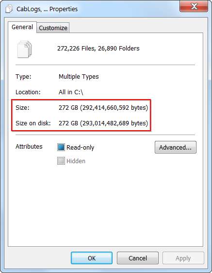 Ancak, C: sürücünüzdeki tüm dosyaları seçerseniz ( gizli dosyalar ve Windows sistem dosyaları ), sağ tıklayın ve Özellikler'i seçin, tuhaf bir şey fark edeceksiniz. Dosyalar tarafından kullanılan alan miktarı, sabit sürücünüzde kullanılan alan miktarıyla eşleşmiyor. Burada, C: sürücümüzde 272 GB değerinde dosyamız var - ancak Windows 279 GB alan kullanıyor. Bu 7 GB kadar bir fark - tüm bu GB'ler nereye gitti?