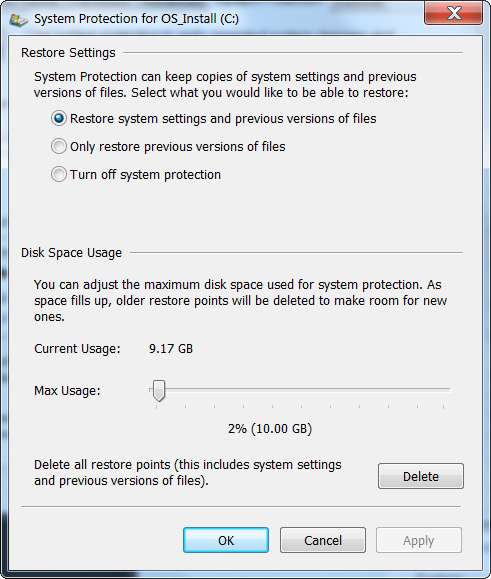 Gölge kopya hizmeti (Sistem Geri Yükleme ve Dosyaların Önceki Sürümleri) tarafından kullanılan sabit sürücü alanı miktarını ayarlamak için şu kılavuzu izleyin: Windows 7'de Sistem Geri Yüklemenin Daha Az Sürücü Alanı Kullanmasını Sağlayın