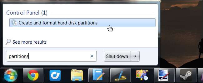 Bölümleri kontrol etmek için, Windows ile birlikte verilen Disk Yönetimi uygulaması . Başlat'a tıklayın, yazın bölümler ve seçin Sabit disk bölümleri oluşturun ve biçimlendirin Açmak için kısayol.