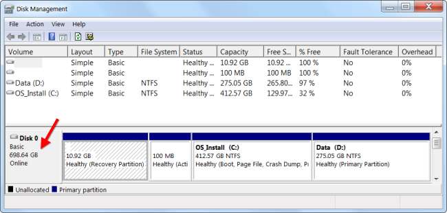Sabit sürücü, Disk Yönetimi penceresinde doğru boyutunu bildirmelidir. Aşağıdaki ekran görüntüsünde görebileceğimiz gibi, sabit sürücü alanının yaklaşık 11 GB'ı gizli bir kurtarma bölümü için ayrılmıştır. Bu, kendi geliştirmediğiniz dizüstü bilgisayarlar ve diğer bilgisayarlar için oldukça tipiktir.