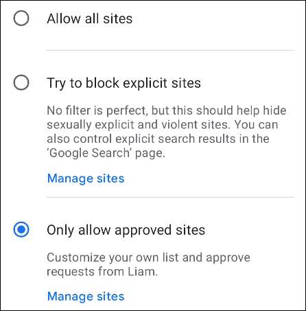 - Onaylanmış sitelere izin ver: Onaylı sitelerin bir listesini oluşturursunuz, artı çocuğunuz sitelere erişim talebinde bulunabilir.