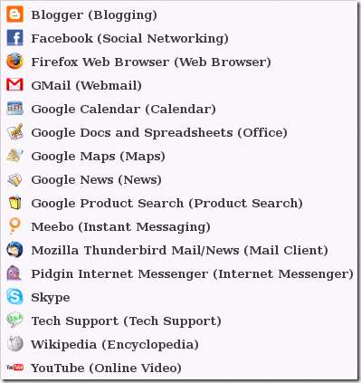 Ось список попередньо встановлених (посилань на) веб-додатків. Також встановлений Open Office, а також деякі дрібні ігри, щоб витратити час.