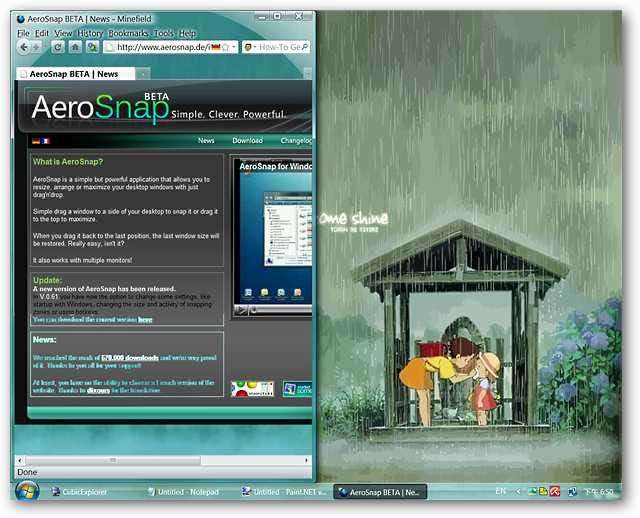 AeroSnap надзвичайно простий у використанні ... просто візьміться за верхню частину вікна програми та перетягніть її ліворуч, праворуч або зверху екрана. Оскільки ми встановили це на Windows Vista, ми обов’язково включили функцію «Попередній перегляд» у розділі «Параметри». Ми почали з перетягування нашого вікна Firefox 3.7 вліво ... як тільки ми підійшли ближче до краю екрану, ви зможете побачити, що ліва половина екрану тимчасово "затінена".