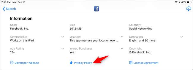 Однак Apple робить щось, пов’язане з проблемою! Як на 3 жовтня 2018 р , всі нові програми, завантажені в магазин, повинні мати видиму політику конфіденційності. Нові та оновлені програми в магазині - іншими словами, насправді не кожна програма - матимуть посилання на своїй сторінці магазину програм, на яке ви можете торкнутися, щоб переглянути політику конфіденційності.