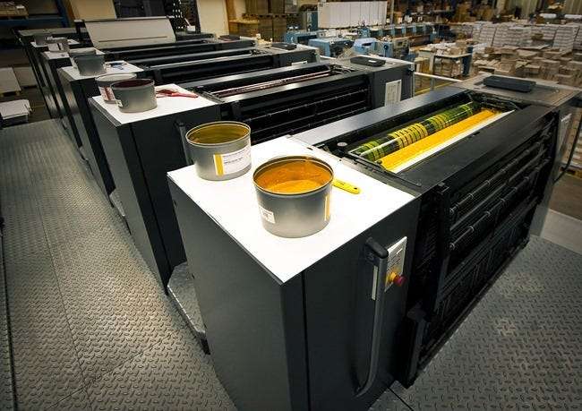 Коли ми говоримо не про ваш офісний струменевий принтер, ми зазвичай говоримо про процеси, які створюють напівтони, лінетони та тверді фігури в якомусь посередницькому матеріалі, що використовується для перенесення чорнила чи тонера на якийсь папір чи підкладку. Або, простіше кажучи, "формує річ, яка наносить чорнило на іншу річ". Зображення, надруковане вище, було, швидше за все, надруковане з допомогою якогось офсетного літографічного процесу, як і більшість кольорових зображень у книгах та журналах у вашому домі. Зображення зменшуються до рядків крапок і наносяться на кілька різних поверхонь друку з кількома різними чорнилами та рекомбінуються для створення друкованих зображень.