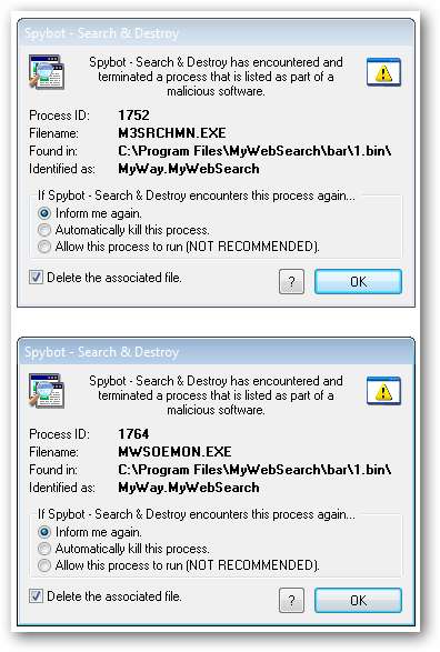 Як ви можете бачити на наступному скріншоті, Spybot Search & Destroy вже наполегливо працював, ловлячи зловмисне програмне забезпечення, перебуваючи в процесі початкового налаштування відразу після запуску ( дуже чудово! ). Знаючи, що обидва вони є шкідливими програмами, ми вирішили вимкнути та видалити обидва процеси.