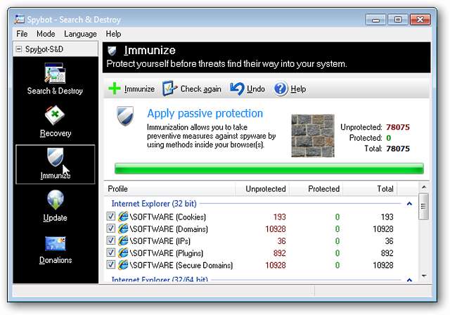 Після закриття вікна оновлень ви повернетесь до головного вікна головного вікна. Зараз хороший час, щоб продовжити і імунізувати свою систему. Тут ви можете побачити кількість імунізації, яку можна застосувати (незахищений проти захищений). Клацніть на кнопку «Імунізувати зелений знак плюс», щоб застосувати імунізацію. Це не тільки допомагає встановленим браузерам, але й покращує файл хостів.