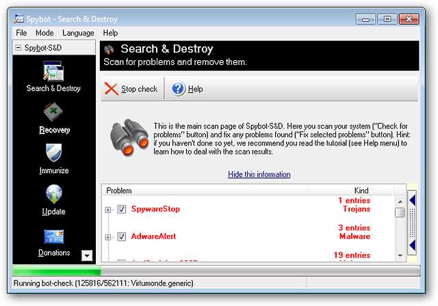 Примітка. Пошук та знищення Spybot займе деякий час, щоб завершити сканування, тому будьте терплячі. Чекати цілком варто!