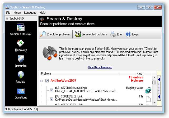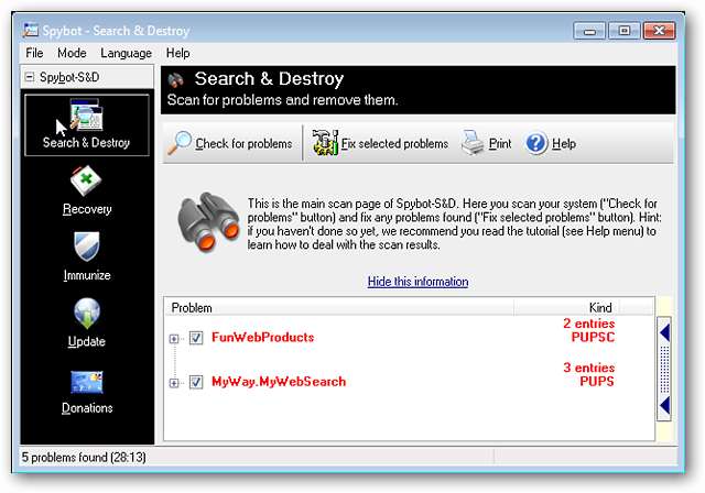 Після того, як Spybot Search & Destroy закінчить сканування на наявність зловмисного програмного забезпечення, у нижньому лівому куті вікна буде перелічено кількість проблем. В основній частині вікна ви можете побачити складений список знайденого.