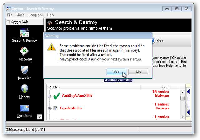 Якщо у вас є шкідливе програмне забезпечення, яке видаляється під час перезавантаження, Spybot Search & Destroy також проведе цілком нове сканування, а також під час процесу, якщо будь-яке шкідливе програмне забезпечення намагається відновити себе під час перезавантаження. Ваша система не завершить перезапуск повністю, поки сканування не завершиться, тому ви можете очікувати, що побачите чорний екран.
