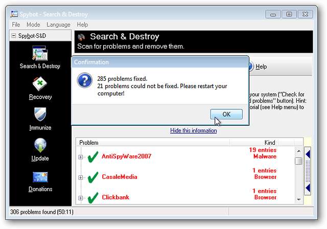 Як ви можете бачити з нашого прикладу, частина шкідливого програмного забезпечення намагалася відновити себе під час перезавантаження, але Spybot Search & Destroy її легко виявив. Щоб видалити виявлені проблеми з шкідливим програмним забезпеченням, виберіть “Виправити вибрані проблеми”. Після натискання кнопки «Виправити вибрані проблеми» ваша система завершить перезапуск.