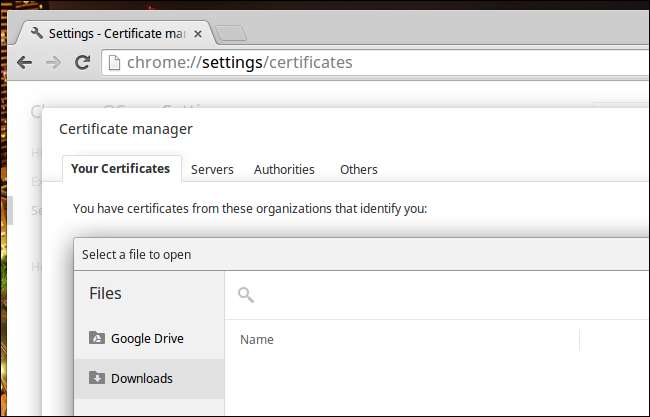 Якщо вам потрібно встановити файли сертифікатів, вам потрібно буде це зробити на іншій сторінці. Організація, яка керує VPN, надасть ці файли, якщо вони вам потрібні. Спочатку завантажте їх на свій Chromebook. Далі введіть chrome: // settings / сертифікати у свій адресний рядок і натисніть Enter. Ви також можете шукати на сторінці налаштувань "сертифікати", щоб знайти цей екран.