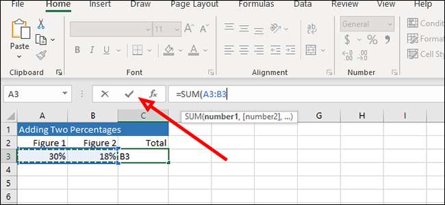 Після виділення вибраних клітин, натисніть "Введіть" на клавіатурі, або натисніть галочку у створювачі формули, щоб виконати формулу та відображення суми ваших відсотків.