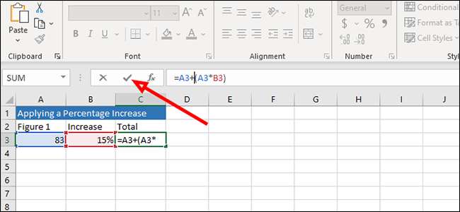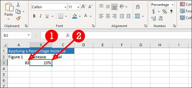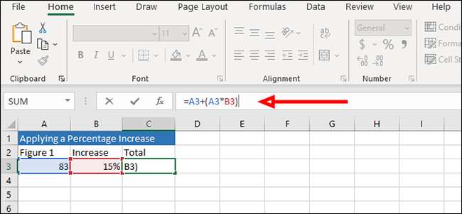 Ми будемо застосовувати формулу, яка розповідає Excel, щоб взяти 15% від 83 (або 12.45) та додати його до нашого початкового числа (83). Це дасть нам бажаний результат, збільшення 15% або 94,45. Ви можете додати наступну формулу до порожньої комірки, або бар Формула:
