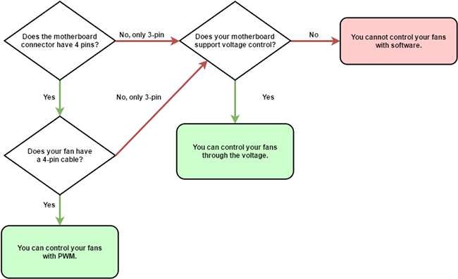 Вентилятори, підключені до материнської плати, бувають двох різновидів: з 3-контактними кабелями та з 4-контактними кабелями. Крім того, ваша материнська плата може мати 3-контактні розетки або 4-контактні (або обидва!). Наявність 4-контактного вентилятора, підключеного до 4-контактної розетки, ідеально підходить, оскільки 4-контактні з'єднання дозволяють керувати вентиляторами широтно-імпульсна модуляція , або ШІМ.