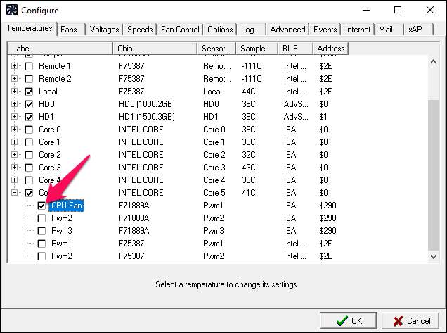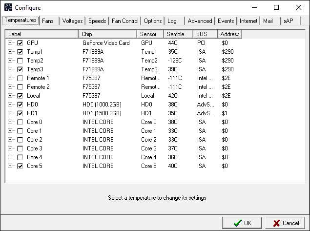 Крім того, не всі ваші датчики можуть бути видимими в головному вікні SpeedFan, залежно від того, скільки у вас є. Якщо натиснути кнопку «Налаштувати» і перейти на вкладку «Температури», ви побачите повний список. Якщо ви не впевнені, що таке будь-який із цих датчиків, спробуйте завантаження такого інструменту, як HWMonitor і зіставляючи його значення зі значеннями SpeedFan, щоб ви знали, що до чого.