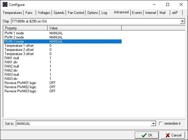 Почнемо грати з деяких елементів керування вентиляторами. Натисніть кнопку Налаштувати та перейдіть на вкладку Додатково. Клацніть на розкривне меню «Чіп» і виберіть зі списку чіпсет материнської плати. Клацніть на параметри «ШІМ-режим» і переконайтеся, що всі вони встановлені на «РУЧНІ», використовуючи спадне меню в нижній частині вікна.