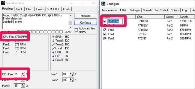 Отже, на вкладці «Вентилятори» вікна конфігурації я перейменував Fan1 на «Вентилятор ЦП». Я також перейшов на вкладку "Швидкості" і перейменував "Pwm1" у "CPU Fan". Щоб перейменувати елемент, просто виділіть його та натисніть F2. Коли ви натиснете OK, зміни розповсюдяться на основний інтерфейс SpeedFan, як показано нижче.