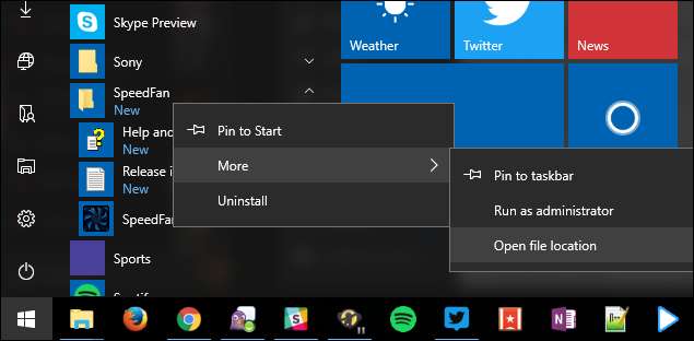 По-перше, ми встановимо SpeedFan для запуску з Windows. Дивно, але SpeedFan не має вбудованої опції для цього, тому ми зробимо це вручну за допомогою папки запуску Windows. Відкрийте меню «Пуск», перейдіть до пункту програм SpeedFan і клацніть правою кнопкою миші на піктограмі SpeedFan. Перейдіть у меню Більше> Відкрити розташування файлу.