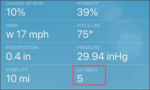Яблуко Погода додаток , який приходить попередньо встановлений на iPhone та iPad, включає в себе індекс УФ. Відкрийте додаток до поточного місцезнаходження та перейдіть до нижньої частини екрана, щоб побачити індекс УФ.