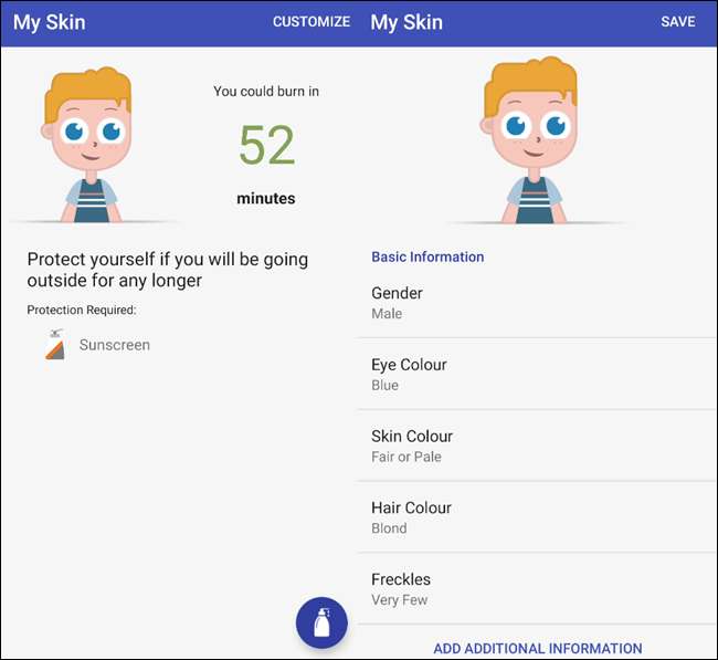 Вкладка "Моя шкіра" - де речі дійсно круто. Ви вводите свій колір очей, колір шкіри та колір волосся, і він використовує цю інформацію, щоб розповісти, як довго це займе для вас, щоб спалити. Торкніться пляшки сонцезахисного крему, і ви навіть можете побачити, як довго триватиметься з захистом і отримувати нагадування про повторне застосування.