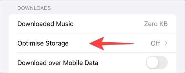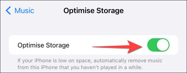 Увімкніть перемикач для «Оптимізувати Storage», а потім IOS буде в кінцевому підсумку видалити сліди більше не слухати в додатку Музика. Крім того, ви можете вибрати, яку кількість пам'яті ви хочете restain для завантаження музики.